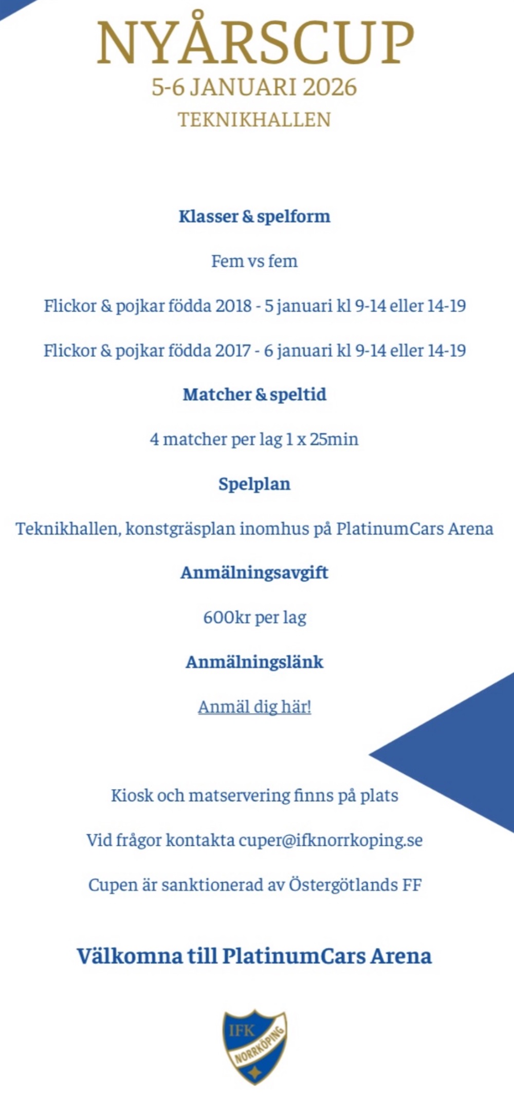 Vi planerar att delta i Nyårscupen som spelas i Teknikhallen (inomhus på konstgräs vid PlatinumCars Arena).